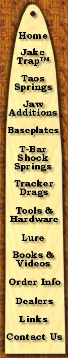Home Jake Trap Taos Springs Jaw Additions Baseplates T-Bar Shock Springs Tracker Drags Tools & Hardware Lure Books & Videos Order Info Dealers Links Contact Us |